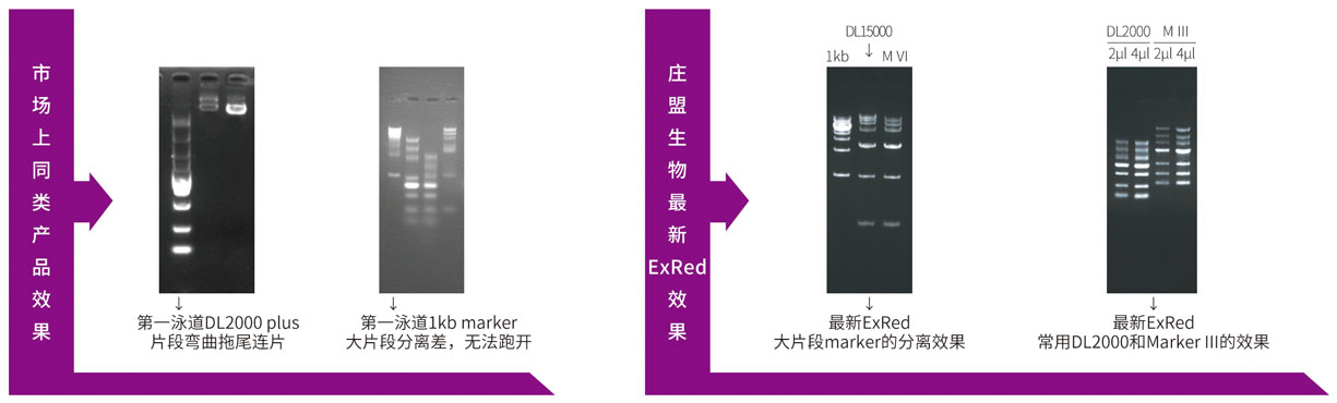 ★ 完全改善大片段的分離效果,極難分離的1kb marker ,40min即可跑開(kāi),且條帶清晰。