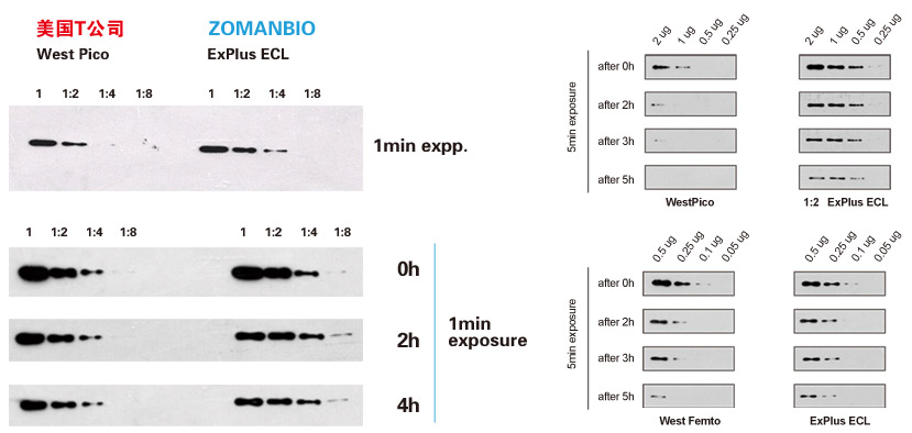 7. 該底物極其敏感,ExPlus ECL底物要求使用比大多數市售底物少得多的樣品、一抗、二抗,通常低至少10-20倍。